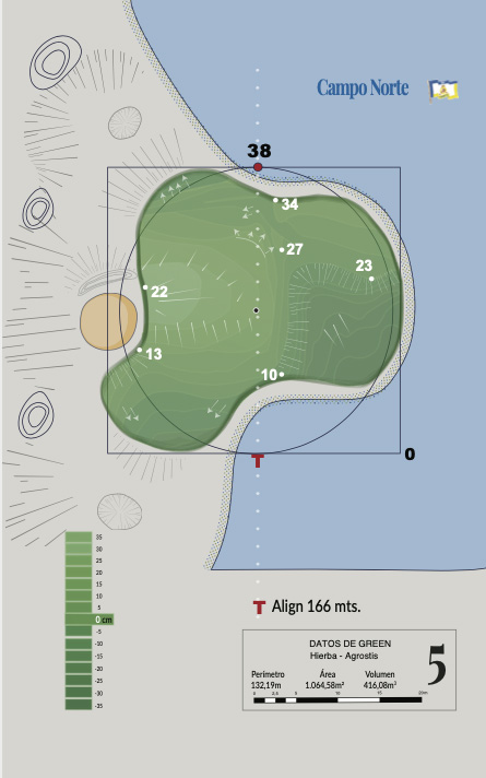 No ser agresivo para evitar pasar el green. De lo contrario quedará un golpe de vuelta difícil. La posición de bandera, puede convertirlo en un hoyo muy fácil o tremendamente complicado.