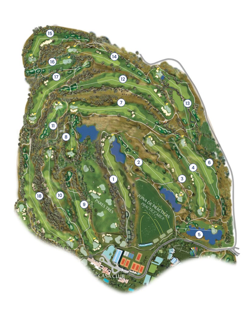 Empezar el juego con cuidado y apoyándose a la izquierda del hoyo. Los señores, dejarán la bola en la plataforma anterior al bunker, para dar un segundo golpe ciego. Cuidado con la izquierda, los árboles pueden atrapar las bolas. La señoras tienen ventaja en general, colocan la bola en bajada. Precaución, si acortamos por la izquierda, se nos quedará la bola en un rough imposible.